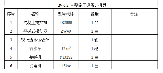 本工法涉及的主要機具包括:混凝土攪拌機、平板式振動器、現(xiàn)場透水試驗儀、割縫機、灑水車、發(fā)電機等(見表6.2),輔助設(shè)備包括:直角尺、鋼尺、水準(zhǔn)儀等。
