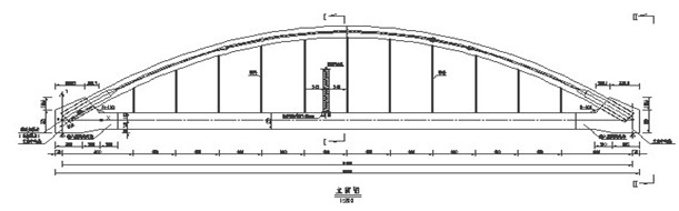 拱肋采用鋼管混凝土結(jié)構(gòu),計算跨徑64m。拱軸線采用二次拋物線,矢跨比f/L=1/5,矢高f=12.8m,理論計算跨度L=64m,理論拱軸線方程為Y=0.8X-0.0125X2。起拱線位于梁下1.1m,每片拱肋由2根上、下鋼管(φ700×18mm)和兩塊厚18mm鋼板(外邊距40cm)焊接成啞鈴型斷面。拱肋高度1.65m,兩道拱肋中心間距7.1m。拱肋間設(shè)置三道橫撐,其中邊橫撐為K撐,中間撐為一字撐。橫、斜撐均為鋼管混凝土結(jié)構(gòu),橫撐鋼管直徑700mm,壁厚16mm;斜撐鋼管直徑500mm,壁厚14mm。全橋拱肋共設(shè)11對吊桿,除拱腳至第一根吊桿間距為8.0m外,其余吊桿中心間距均為4.8m,吊桿采用PESFD7-61新型低應(yīng)力防腐成品索體,冷鑄錨錨固。