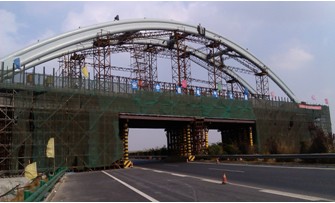1、海青鐵路跨威烏高速公路64米系桿拱橋于2012年5月18日開工,通過預(yù)制條基、鋼管法蘭及螺帽調(diào)垂直度等技術(shù),過車門洞施工用7天時間,就正?;謴?fù)交通。