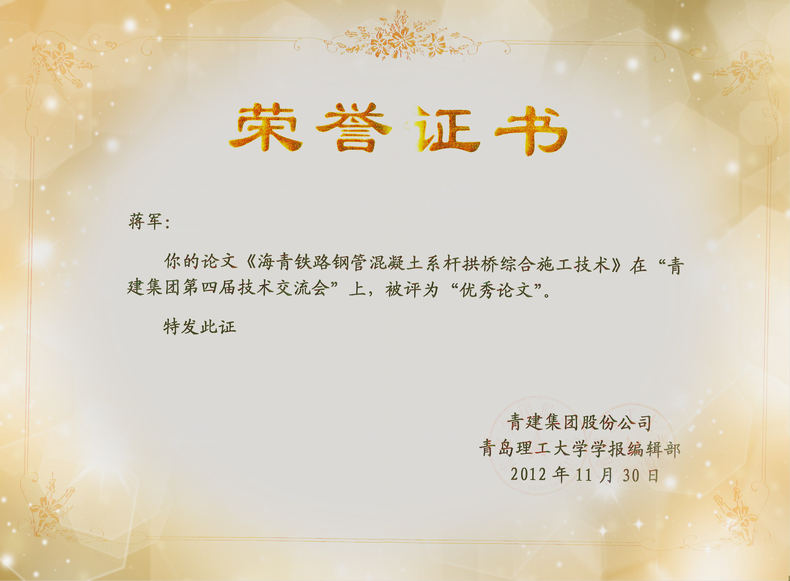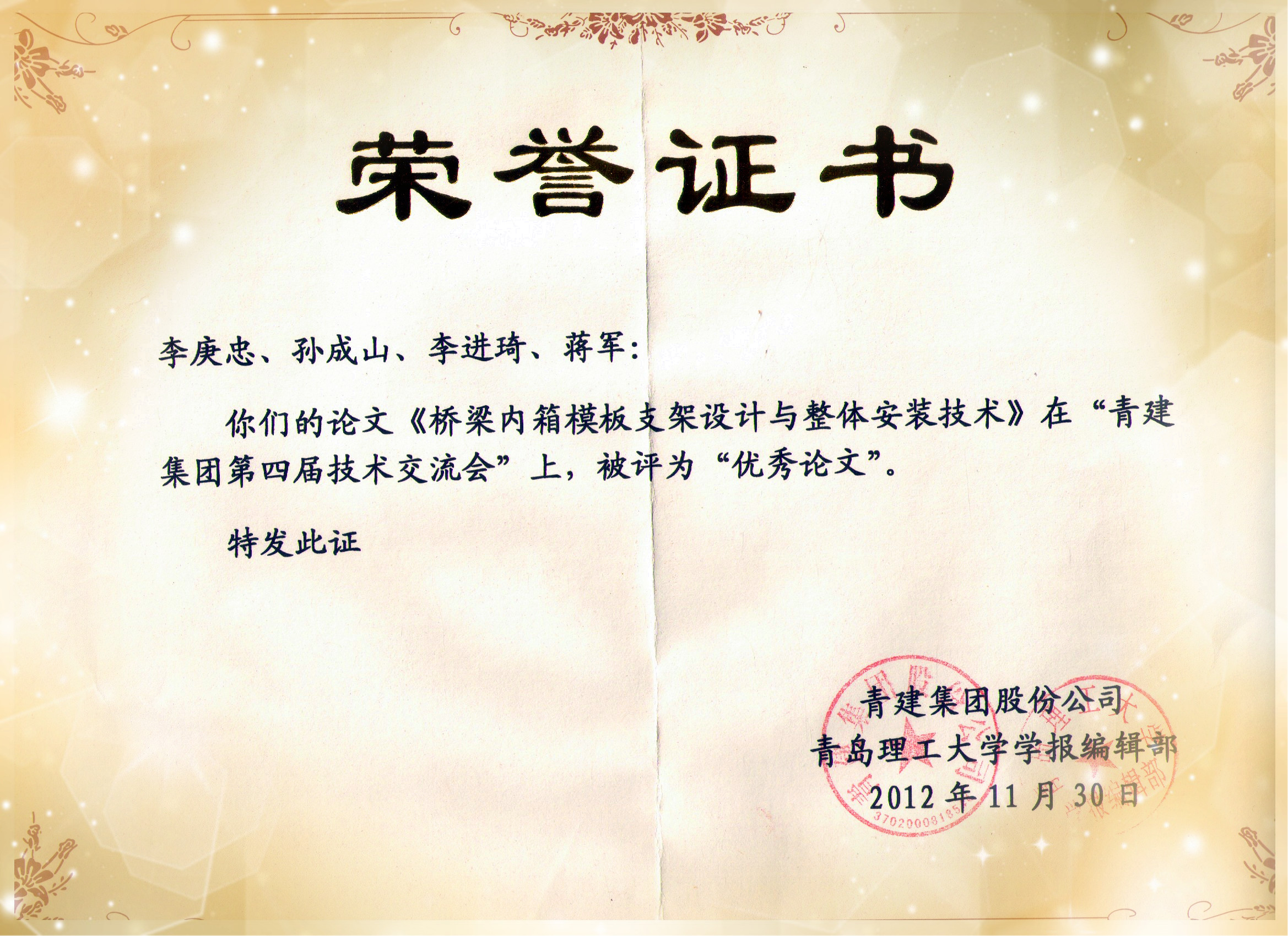 本次交流會(huì)議是繼青建集團(tuán)首屆(2006)、第二屆(2008)、第三屆(2010)技術(shù)交流會(huì)成功舉辦之后的又一次技術(shù)盛會(huì),以“交流、創(chuàng)新、合作、共贏”為宗旨,在校企雙方共同交流的基礎(chǔ)上,聘請(qǐng)國(guó)內(nèi)知名專(zhuān)家進(jìn)行專(zhuān)題講座,為廣大科技人員奉獻(xiàn)了一場(chǎng)知識(shí)盛宴。本次參會(huì)的論文主要是結(jié)合近年來(lái)集團(tuán)各公司及成員單位項(xiàng)目施工過(guò)程中的重點(diǎn)、難點(diǎn)技術(shù)總結(jié)完成。共收集論文77篇,評(píng)選出優(yōu)秀論文26篇。我公司共提交論文7篇,其中《海青鐵路鋼管混凝土系桿拱橋綜合施工技術(shù)》(作者:蔣軍)、《橋梁內(nèi)箱模板支架設(shè)計(jì)與整體安裝技術(shù)》(作者:李庚忠)獲得優(yōu)秀論文,蔣軍代表公司在會(huì)上作了交流匯報(bào),優(yōu)秀論文作者獲得了集團(tuán)股份公司與青島理工大學(xué)??庉嫴柯?lián)合頒發(fā)的榮譽(yù)證書(shū),含優(yōu)秀論文在內(nèi)的5篇論文將在《青島理工大學(xué)學(xué)報(bào)》上公開(kāi)發(fā)表。