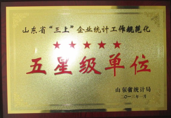 2013年,山東省統(tǒng)計局為推進(jìn)“四大工程”建設(shè),加強(qiáng)企業(yè)統(tǒng)計基礎(chǔ)工作,確保源頭數(shù)據(jù)真實準(zhǔn)確、完整,開展了“山東省‘三上’企業(yè)統(tǒng)計工作星級單位”的評定工作,經(jīng)評選,我單位被省統(tǒng)計局授予“山東省三上企業(yè)統(tǒng)計工作規(guī)范化五星級單位”的光榮稱號。