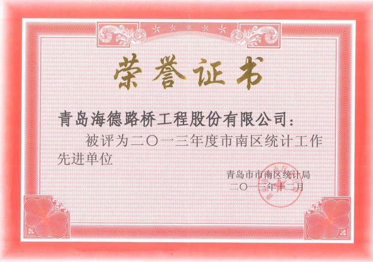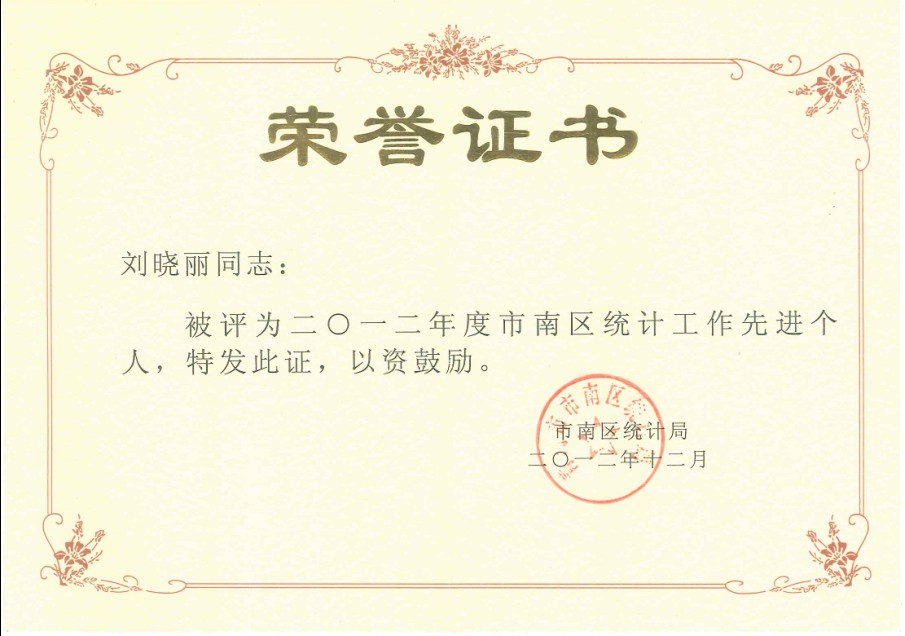 經(jīng)過山東省、青島市、市南區(qū)統(tǒng)計單位的層層審核,我單位最終被授予“省級五星級單位”的稱號。另外,由于上報統(tǒng)計報表數(shù)據(jù)及時準(zhǔn)確,我單位2013年再次被市南區(qū)統(tǒng)計局授予“市南區(qū)統(tǒng)計工作先進(jìn)單位”的稱號,合約部劉曉麗也在201212月榮獲“市南區(qū)統(tǒng)計工作先進(jìn)個人”的榮譽(yù)稱號,并頒發(fā)榮譽(yù)證書予以通報表揚(yáng)。