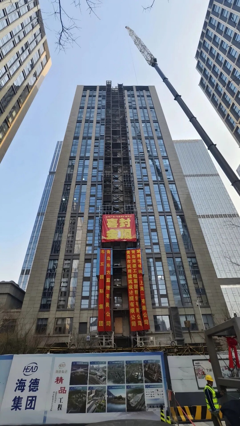 項(xiàng)目位于青島市嶗山區(qū)苗嶺路28號金嶺廣場1號樓西側(cè)園區(qū),金嶺廣場作為嶗山區(qū)的現(xiàn)代化商務(wù)地標(biāo)建成于2013年,總高27層,隨著入駐企業(yè)的不斷增多以及辦公人員規(guī)模的日益增長,初始配備的4部電梯已無法滿足日常的垂直交通需求,在上下班高峰時段,電梯面臨較大的客流壓力,導(dǎo)致等待時間較長,嚴(yán)重影響辦公效率。本項(xiàng)目將在1號樓西側(cè)增設(shè)兩部外裝電梯,每臺電梯???8站,鋼結(jié)構(gòu)電梯井道高度達(dá)103.2米,這一數(shù)據(jù)刷新了全國既有建筑后裝電梯的高度紀(jì)錄,成為目前已啟動同類工程中的“高度之最”。項(xiàng)目建成后將極大緩解1號樓高峰時段的客流壓力,減少辦公人員的等待時間,提升整體辦公效率,為入駐企業(yè)和辦公人員創(chuàng)造更加便捷、高效的辦公環(huán)境。