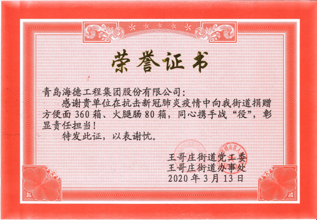 集團(tuán)董事長(zhǎng)鞏光磊在得知王哥莊街道社區(qū)防控一線人員加班加點(diǎn)為周邊居民做好防控吃飯不便的情況下,迅速采購(gòu)物資,為王哥莊街道送去360箱方便面、80箱火腿腸作為后勤保障。集團(tuán)一直熱心公益事業(yè),自新型冠狀病毒感染肺炎疫情發(fā)生后,集團(tuán)、各分支機(jī)構(gòu)及所有員工都伸出援助之手抗擊疫情,已向嶗山區(qū)紅十字會(huì)、嶗山區(qū)沙子口街道、膠州區(qū)李哥莊、王哥莊街道等多地捐款捐物,攜手戰(zhàn)“疫”彰顯海德責(zé)任擔(dān)當(dāng)。